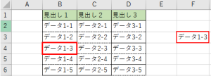 関数を使用してどのように参照させるかわかりやすくするために表を用いて解説していきます。「データ1-3」を関数を用いて表示させます。
