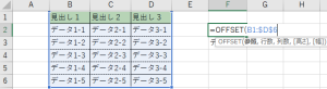 選択範囲の上から「0」スタートの数え方をするので「データ1-3」は「3」になります。「=OFFSET(B1:$D$6,3」