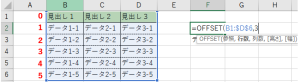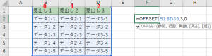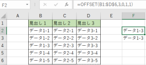 選択範囲の左から「0」スタートの数え方をするので「データ1-3」は「0」になります。「=OFFSET(B1:$D$6,3,0」