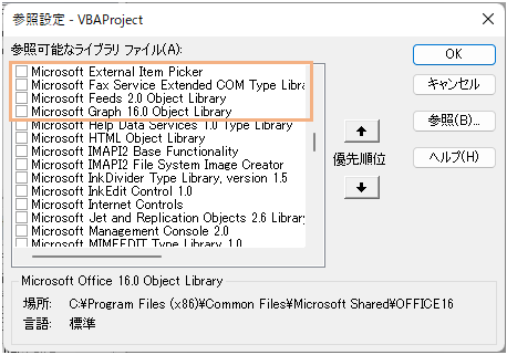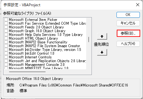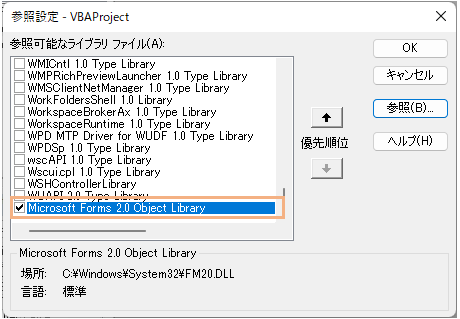「Microsoft Forms 2.0 Object Library」が一覧に表示されますので、チェックし「OK」をクリックします。