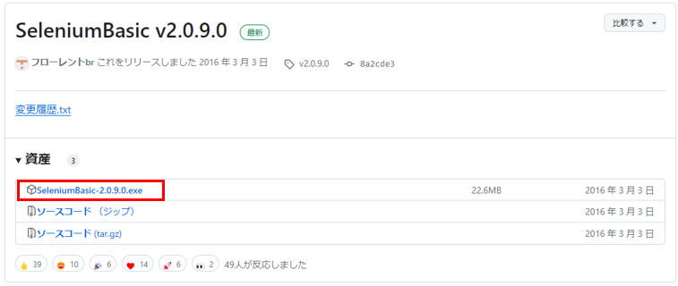 GitHubのSeleniumBasicダウンロードページにて「SeleniumBasic-2.0.9.0.exe」ファイルをダウンロードします。