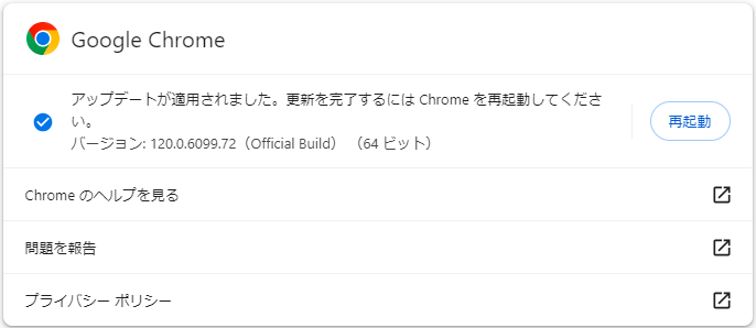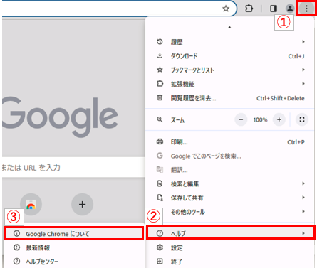①右上の「3つの点」>②「ヘルプ」>③「Google Chromeについて」を順にクリックします。