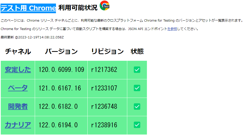 Chrome for Testing availabilityのサイト(https://googlechromelabs.github.io/chrome-for-testing/)にアクセスして、該当のバージョンのChannelをダウンロードします。
